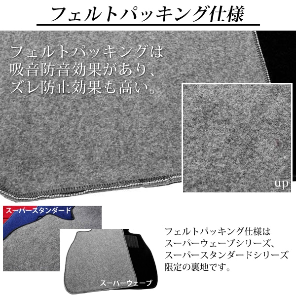 上生地はカット&ループのウェーブ柄を施してありシックで高級感溢れるデザインです。 マットの裏側はフエルトバッキング仕様になっており、ゴムバッキング仕様に比べて吸音防音効果が期待できます。 フエルトの素材には特殊な糊を配合してあるため、マット装着時にはゴムバッキングのスパイクと同等のズレ防止効果がございます。 フエルトと基布の間には特殊フィルムをサンドしているため水の貫通などを防ぐ効果もございます。 フエルトバッキング仕様のフロアマットはマット自体の重量も軽くなり理論上、燃費効率が良くなります。 トヨタ アベンシスワゴン AZT250W AZT251W AZT255W 平成15年10月〜平成20年12月 スーパースタンダードシリーズ 【フロアマット】